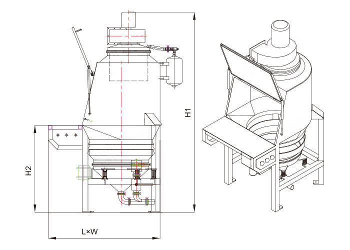 小袋卸投料站:该系统由人工卸料仓、防压型投料平台、下料仓、振动筛、过滤系统、集尘系统、反吹气囊及振动电机等部件组成。